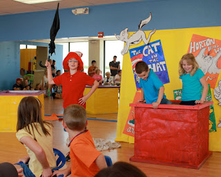 They put together the song with choreography and four mini plays for this performance. Jaden was in three of the four mini plays. The first one was the "Cat in the Hat." Jaden played Nick -- one of the kids whose mother goes out for the day and the Cat in the Hat visits them.